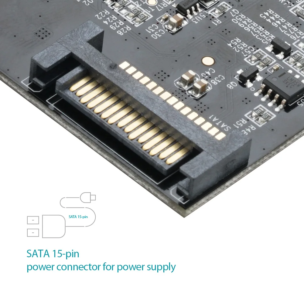 The 15-pin SATA power connector supplies power to USB-C enabled devices, and supports up to 5V 900mAh output on each USB 3.1 port.