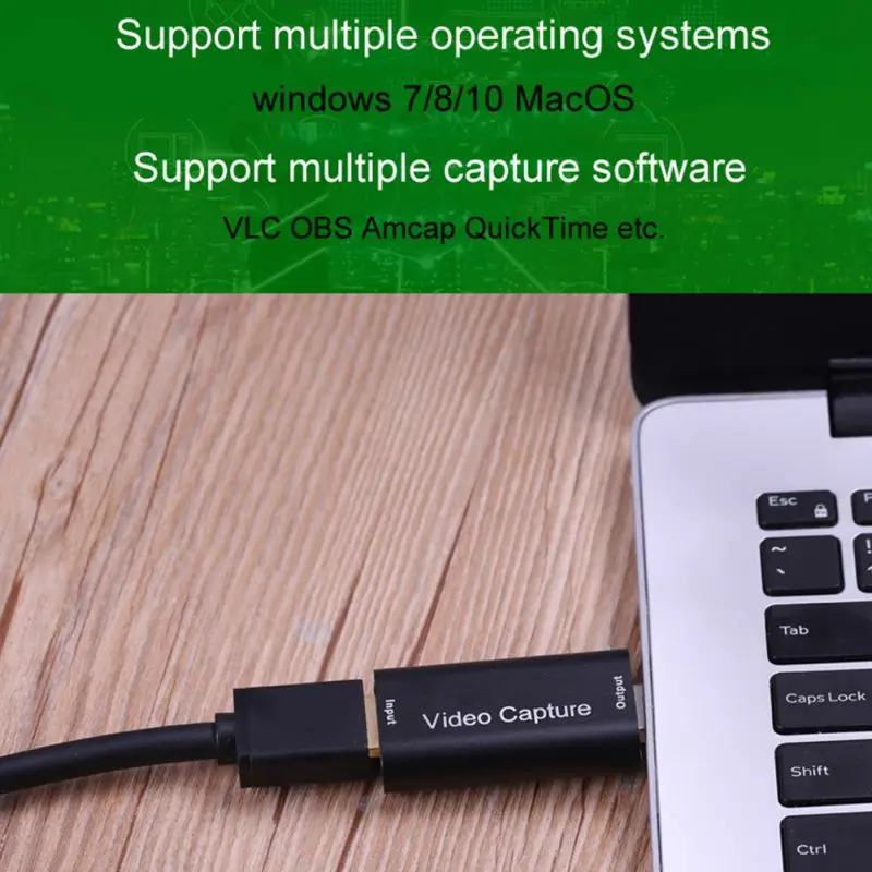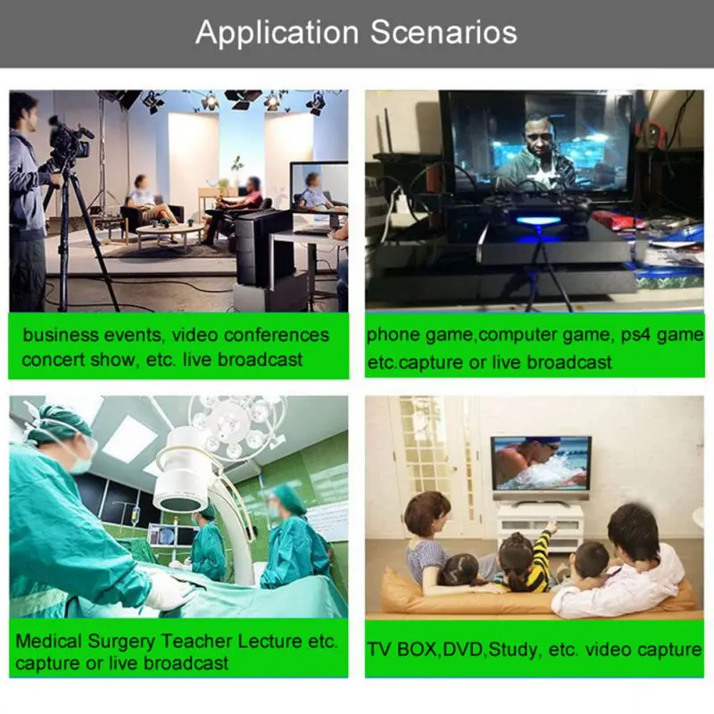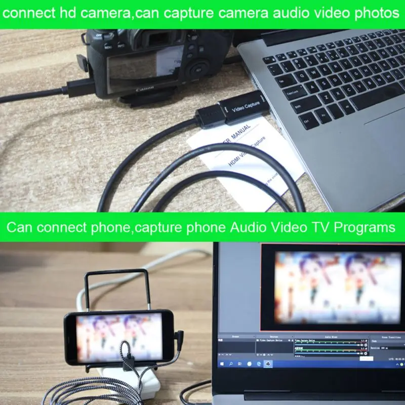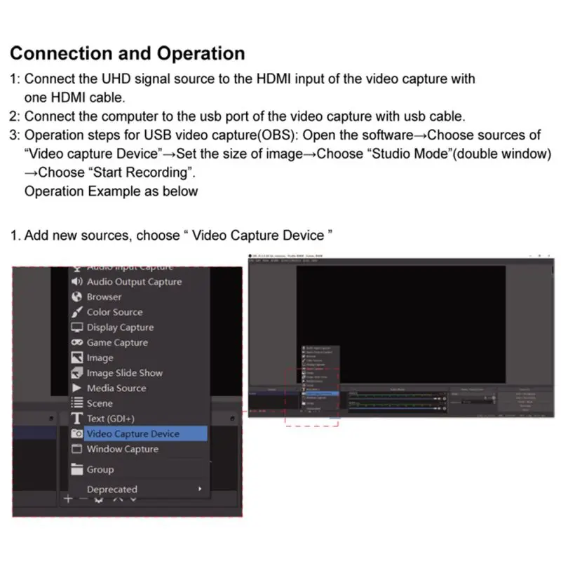 Product introduction:This USB 2.0 capture card can capture HDMI video and HDMI audio at the same time. It can transmit audio and video signals to a computer and smart phone for preview and storage. Suitable for high-definition acquisition, teaching recording, medical imaging, etc.Features:* Support maximum input resolution up to 4K;* Support maximum output resolution up to 1080P;* Support 8/10/12 bit color depth;* When using standard AWG26 cable, input transmission distance up to 15 meters (1080P and below resolution);* Support most acquisition software, such as VLC, OBS, Amcap, etc .;* Support Windows, Android and MacOS;* Comply with USB video UVC specifications;* Complies with USB audio UAC specifications;* No external power supply, compact size and easy to carry.AProduct Specifications:specification:HDMI resolution: the highest input can support 4KVideo input format: 8/10 / 12-bit color depthVideo output mode: YUV, JPEGVideo output resolution: Maximum output resolution 1080PSupport audio format: L-PCMInput cable length: ≤15 meters, AWG26 HDMI standard cableMaximum working current: 0.4A / 5VDCOperating temperature range: (-10 to + 55 ℃)Size: 64x28x13 (mm)Weight: 21.4gConnection operation:1: Connect the UHD signal source and the HDMI input port of the USB capture card through 1 HDMI cable2: Plug the USB header of the USB capture card into the USB port of the computer3: Acquisition operation steps (OBS): Open the software → add a new source → select ‘video capture device’ → set the screen size →Select ‘Studio Mode’ (dual window) → click ‘Start Recording’, see the example below1. Add a new source and select ‘Video Capture Device’ 2. Set the screen size3. Select ‘Studio Mode’ (dual window) and the above settings are completed.Note: Computer-side hardware configuration requirementsCPU: PC i5-3400 or above; NB i7-3537U 2.0GHZ or aboveGraphics card: PC NVIDIA GT630 or above; NC NVIDIA GT735M or