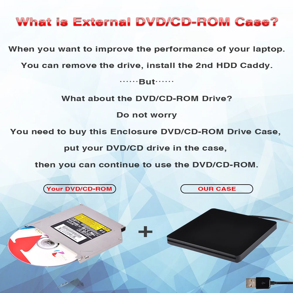 Product model: ECD018-SAU3 Applicable products: notebook computers, desktop computers Features: 1. 9.5mm Super slim portable External DVDRW Case 2. Slot in 3. Compatible with macbook and other laptops 4. No additional software drives needed 5.Support Window2K/XP/2003/Vista/7, Linux , Mac 10 OS Note:1.It is just an External DVD Case,it does not include the CD-ROM Drive. Package Including: 1 PCB board 1 Specification 1 USB data cable 1 Case