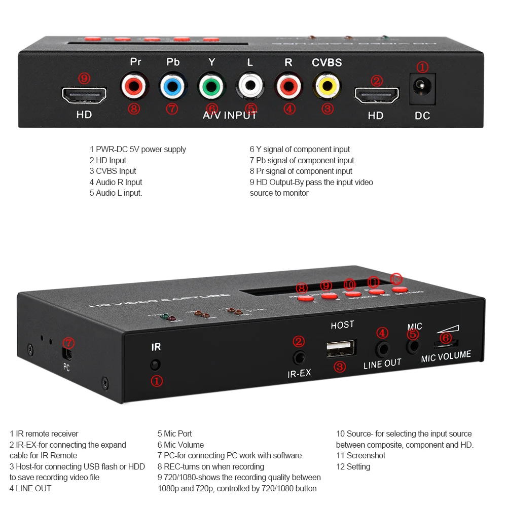 *With video source button and 720p / 1080p recording quality selection button. Get Record/stop. Video source selection, 720p/1080p selection and snap shot functions with remote control.