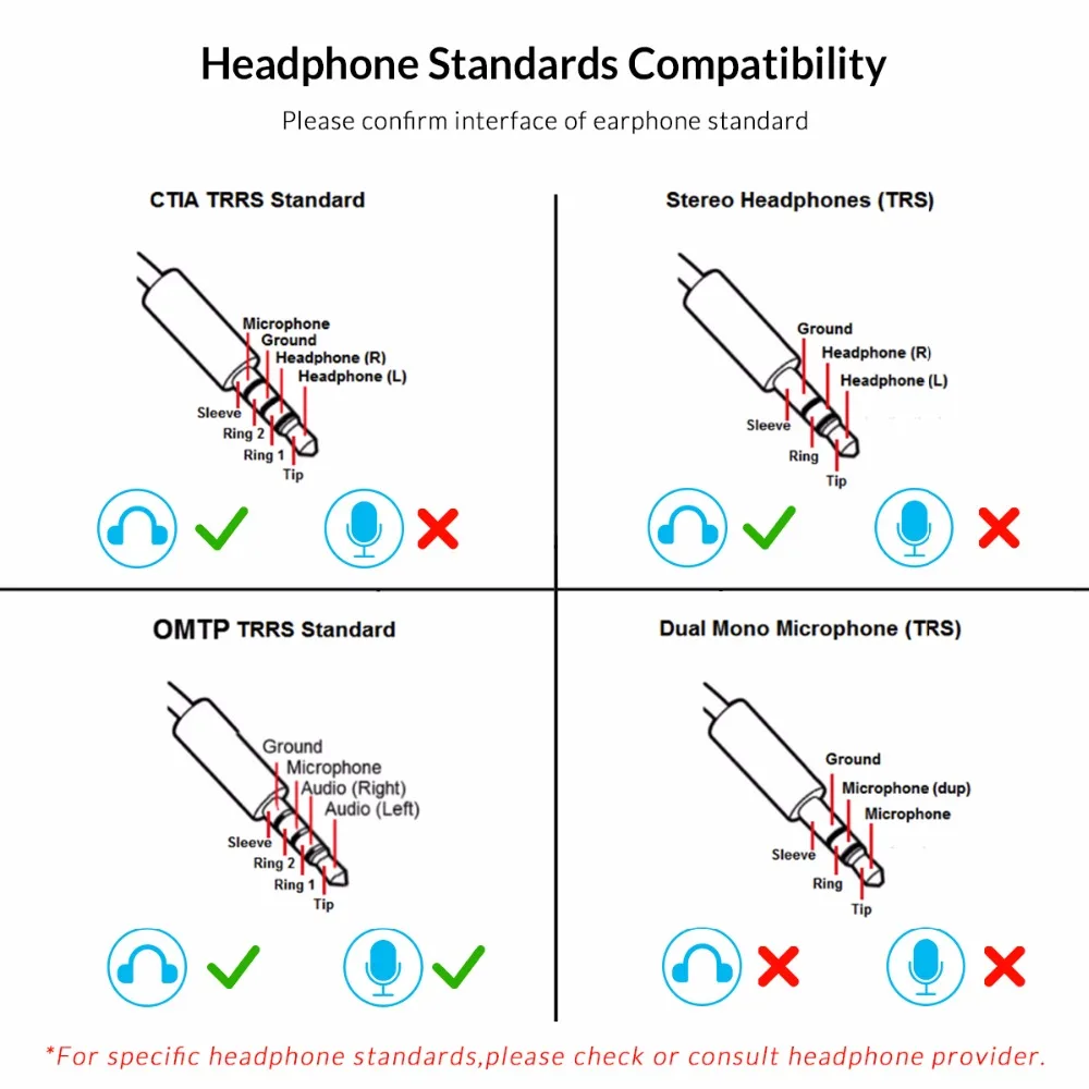 SPECIFICATION The microphone of this product conforms to national OMTP standard,and the microphone function may not be available for some international CTIA standard headphones,but it does not affect the earphone function. For specific headphone standards,please check or consult headphone provider.