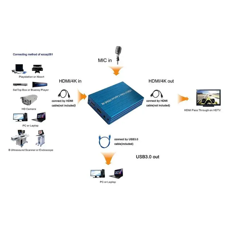 4K 60Hz HDMI Video Capture USB3.0 HDMI to USB Video Capture Card Dongle For Game Streaming Live Stream Broadcast with Mic