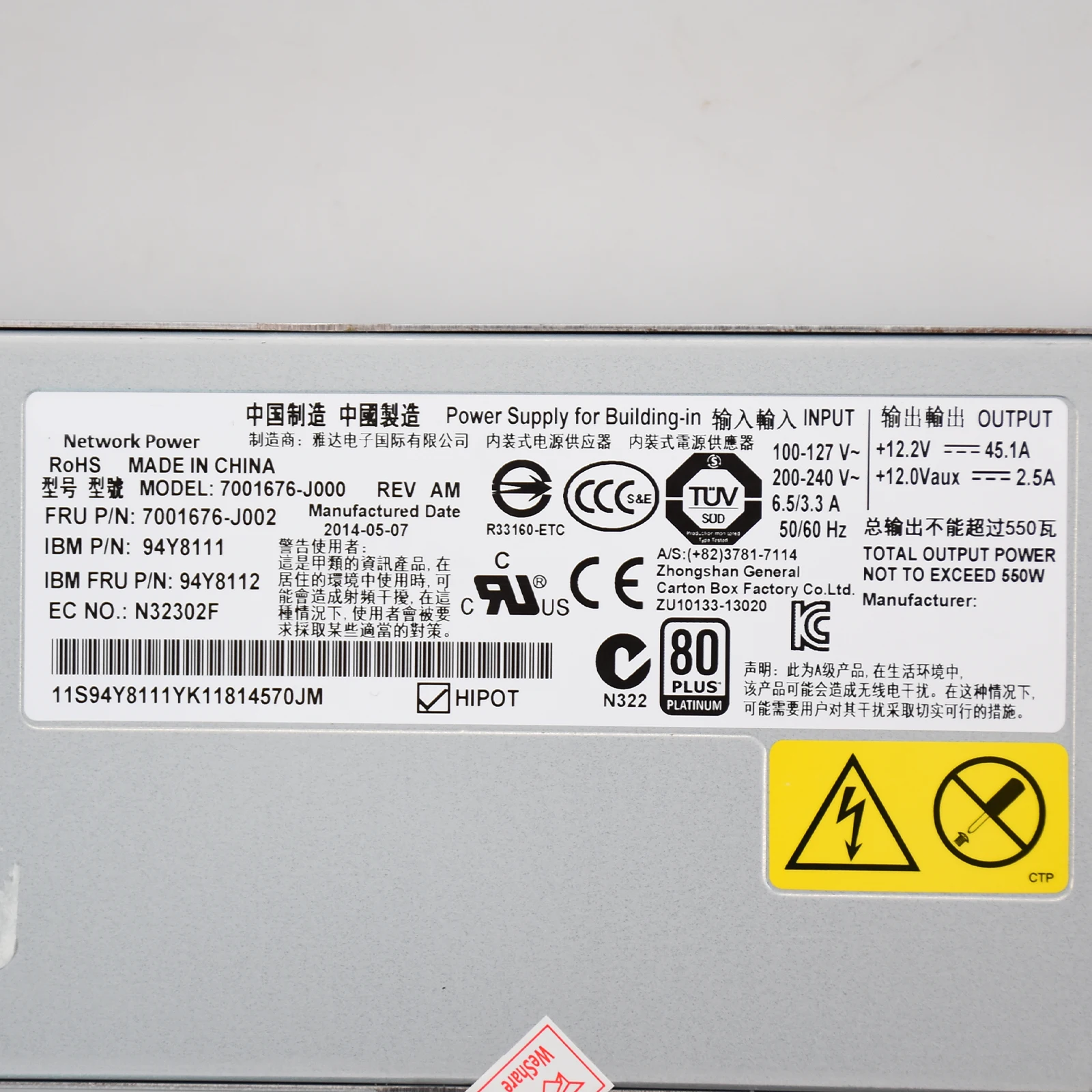 | For IBM X3550 X3650M4 550W Server power 94Y8111 94Y8112 7001676-J002 Power Supply |