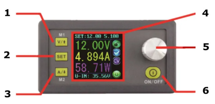 1-Voltage setting/Page up to choose/Shortcut extract M1 data group 2-Data setting/ Extract value of the specified data group/Store value into the specified data group 3-Current setting/Page Down to choose/Shortcut extract M2 data group 4-1.44 inch color LCD screen 5-Coding potentiometer/Data adjustment/Lock all buttons 6-Open or close output Display interface description