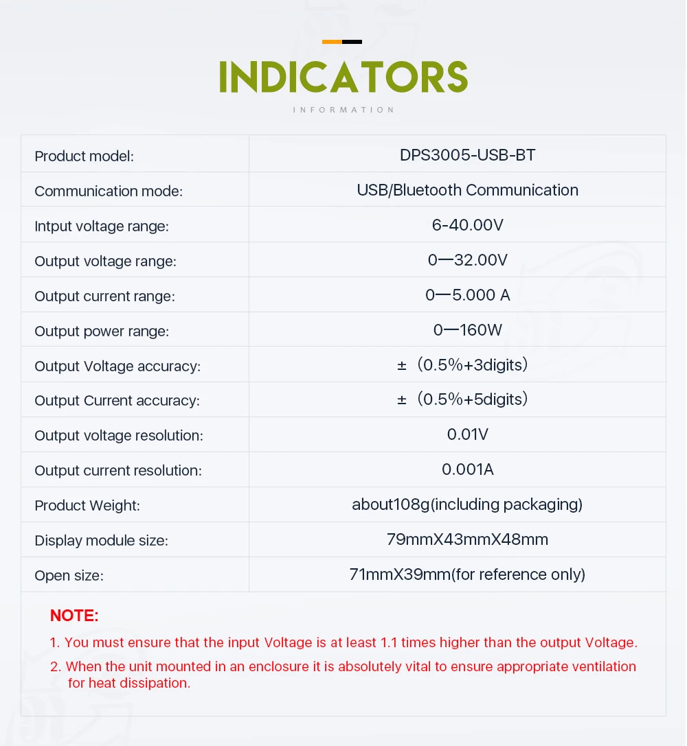 Technical parameters Input voltage range: 6.00-40.00V Output voltage range: 0V-32.00V Output current: 0-5.000A Output power range: 0-160.0W Product Weight: about 113g Product Dimension: 79*43*48(mm) (L*W*H) Open size: 71mm*39mm Output voltage resolution: 0.01V Output current resolution: 0.001A Output Voltage accuracy: ± (0.5% + 3 digits) Output Current accuracy: ± (0.5% + 5 digit) DPS3005 test video from customer DP30V5A test video from customer 1. https://www.youtube.com/watch?v=OkUWdxM_4pI&list=PLNcr2Rj_07PFfKZ5x1eNRPmagiOQ52bz7&index=2 DPS buck power supply series(DPS3003,DPS3005,DPS5005,DPS3012, DPS5015,DPS5020); DPH buck-boost power supply series (DPH3205 and DPH5005); If you want to see DP50V5A click this https://www.aliexpress.com/item/32596330856.html If you want to see DP30V5A click this https://www.aliexpress.com/item/32613371214.html If you want to see DP30V5A-L click this https://www.aliexpress.com/item/32639806678.html If you want to see DPS3003 click this https://www.aliexpress.com/item/32685187020.html If you want to see DPS3005 click this https://www.aliexpress.com/item/32684316119.html If you want to see DPS5005 click this https://www.aliexpress.com/item/1000004290003.html If you want to see DPS3012 click this https://www.aliexpress.com/item/32685179404.html If you want to see DPS5015 click this https://www.aliexpress.com/item/32702714880.html If you want to see DPS5020 click this https://www.aliexpress.com/item/32821185351.html If you want to see DPH3205 click this https://www.aliexpress.com/item/32762131242.html If you want to see DPH5005 click this https://www.aliexpress.com/item/32840324731.html If you want to see DPS8005 click this https://www.aliexpress.com/item/32849962454.html General Information IN+: Input positive IN-: Input negative: OUT+: Output positive: OUT-: Output negative Note: Input voltage range is DC 6-40V and 40v is the limit voltage; please leave a room to use. Or else it will be burnt. The input must be DC power supply, not AC 220V, or else it will be burnt too. Though this module has reverse connection protection and output short circuit protection, you can muse be in strict accordance with connection description to connect. If you connect the supply power with output, the module will be burnt. Panel description