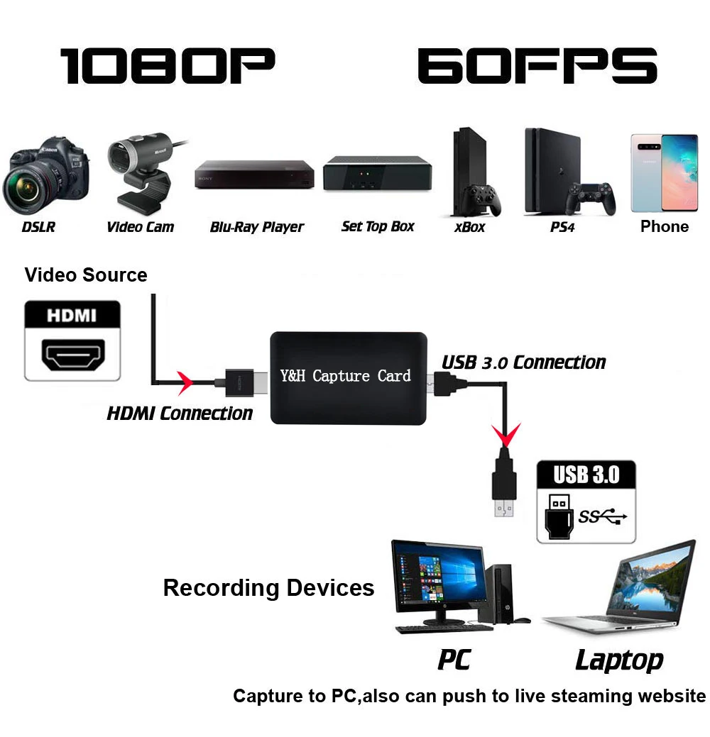 1:Based on the high speed USB 3.0 technology, It can capture one signal channel HD HDMI video signal. Suitable for devices with HDMI output such as blu-ray player, PS3/4, Xbox one , Wii U etc.DON'T work for HDCP2.2 devices 2:NO driver, and it is truly PnP. Low latency for game, meeting, live streaming. Share to youtube, facebook and twitter.Not support Mic-in for commentary; Record HDMI signal source directly, No HDMI splitter needed anymore.Compatible with Windows, Linux, Mac OS X 3:Capture resolutions up to 1080p at 60fps for 1080P video source with hardware accelerated up-scaling/down-scaling. Automatically converts input audio formats to 48 KHz PCM stereo audio 4:Audio & Video Record ability from external devices via HDMI port, easy File Save & Share via Computer, compatible with popular streaming software and services like OBS Studio, VLC etc.【Potplayer/OBS Setting】Link for Y&H HDMI Capture Card: https://www.youtube.com/embed/-kg9XRLFTTM 5:A fast, familiar, and affordable way to share content in the conference room and into online meetings.Connect to present, no software required,Simply connect a laptop or tablet via HDMI to start sharingData