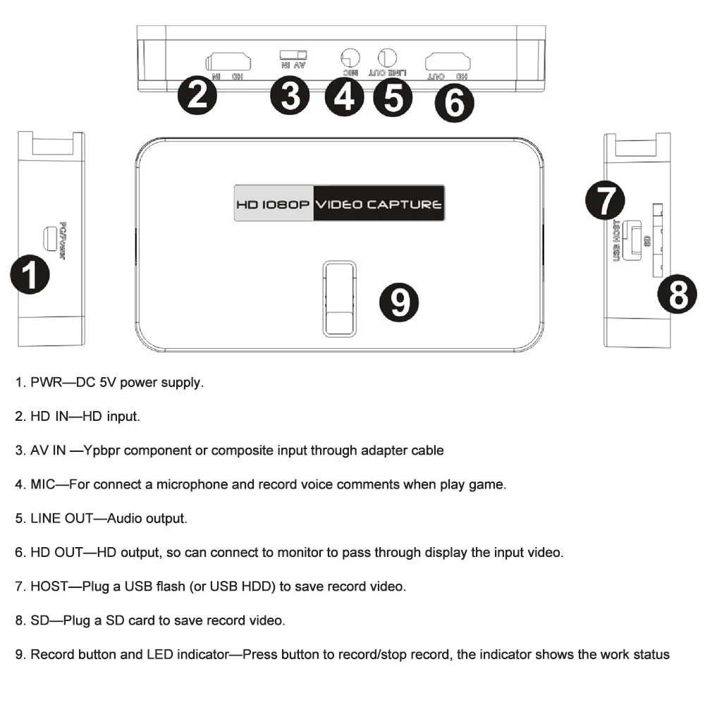 The HD Video Recorder captures videos and games up to 1080p, and then save them into USB Flash Disk, Portable Hard Disk, or SD Card.