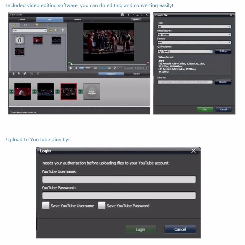 Record Format: AVI MPEG4 (Video), AAC Stereo (Audio).