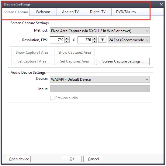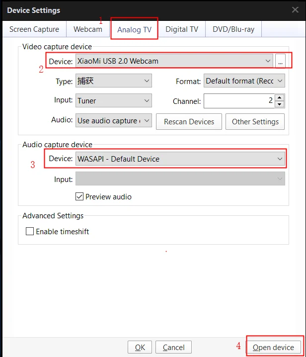 3. Before you capture video,you can make settings as below:Right click → Open → Device Settings: Choose the correct channel settings.