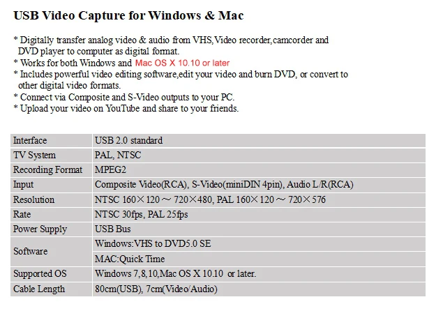This ezcap USB 2.0 Video Capture Card is intended for use on both Windows OS and Mac OS X 10.10 and