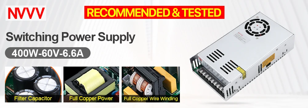 4, for input AC-DC switch power supply, we recommend 400W 60V switch power supply (S06A case leave fix hole size for this version), the following 400W 60V switch power supply is our recommend, but just recommend, not provide any quality guarantee and technology support, you can contact the seller to ask. S-400-60 400W 60V AC-DC switch power supply link: https://www.aliexpress.com/item/4000285813894.html (RECOMMEND and TESTED) Note: Please use the power supply we recommend or some qualified brand power suuply to power on RD6006, Poor quality power supplies may occasionally provide over-voltage when turned on, and the resulting damage must be borne by the customer.