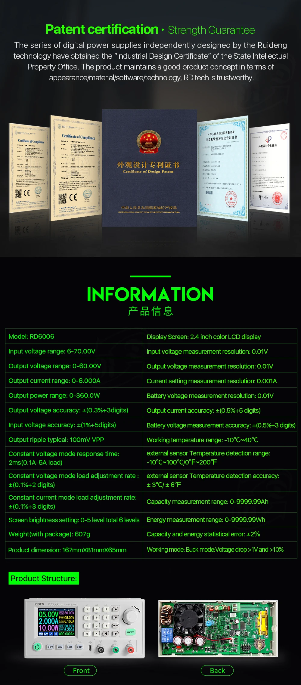 All RD6006/RD6006W instruction and case installation instruction download Link : 1, RD6006(W) operation instructon in English and Russian, PC software instruction , APP instruction ,APP and PC software download link: A: Main download llink : https://drive.google.com/open?id=17V-JWHvqMF-NuWSznEiJ4RKrnn_Pkt5v B: Mediafire:http://www.mediafire.com/folder/ssjf3s35ev68v/RD6006 C: Back up download link : http://www.ruidengkeji.com/rddata/RD6006/RD6006.rar 2, Android APP: search Search RdPower to download at Google Play, or download at file link https://drive.google.com/open?id=17V-JWHvqMF-NuWSznEiJ4RKrnn_Pkt5v, Support android 5.0 and above phone IOS APP download: Search RdPower to download , support IOS8.0 and above phone 3, RD6006 and S06A case or S06D case assemble instruction : https://drive.google.com/open?id=1Bb6Mq3Mp7AGkd6yxwzPqwtv54dozZ4zR 4, RD6006/RD6006W test video: https://www.youtube.com/watch?v=pz0T9rD4Ij0 EEV blog Test Video : https://www.youtube.com/watch?v=0qjLx_HsKUQ&t=2s 5, RD6006/RD6006W Operation instruction video: https://youtu.be/fn6ROhGrLtI Instruction video for manual: a.section 1.4.2.1 Battery Charging Function Introduction: https://youtu.be/irTbqfqtgU0 b.section 1.4.2.2 Output Voltage and Output Current Setting: https://youtu.be/S6Kan66dNsk c.section 1.4.2.3 Data Group Quick Storage and Call out: https://youtu.be/eo5saPjOGpo d.section 1.4.2.4 Keypad lock and unlock: https://youtu.be/zxpmasJyQ6Y e.section 1.4.2.5 System Setting: https://youtu.be/Q9d3rIgIrOc f.section 1.4.2.6 Main Page Style Setting: https://youtu.be/f51VDiY2VHE g:section 1.4.2.7 Storage Data Setting: https://youtu.be/i1kTeurS13I h:section 1.4.2.8 System Information: https://youtu.be/Um4NQObeeJE i:section 2.1.2 IOS APP Download, Installation and Connection: https://youtu.be/nH2HYwop0TE j:section 2.4.2 IOS APP Operation: https://youtu.be/lXSw1CM9IY8 k:section 3.1.1/3.2.3.2 Android APP Download, Installation and Connection: https://youtu.be/QwyBEUCnp9c l:section 3.2.3.3 Anroid APP Operation: https://youtu.be/hqrF4keTfbE m:section 4.1/4.3.1 PC Software Download and basic operation: https://youtu.be/mjt1RMaah1Y o:section 4.3.2 Firmware Upgrade: https://youtu.be/NOoLfDw0DiY p:section 4.3.3 Calibration: https://youtu.be/c9sn1wY2mjE q:section 4.3.4 Logo Update: https://youtu.be/vuVhBsohWts r: RD6006 wifi connection Problem and solution: https://www.youtube.com/watch?v=7sTtc1kweJM 1, RD6006 series has two versions: RD6006 and RD6006-W,RD6006-W have WIFI board , RD6006 don't have . RD6006-W can use WIFI board to connect APP, also use USB micro cable to connect PC solftware . RD6006 don't have WIFI board, only support PC software by connecting with USB micro cable, no support APP. For wifi board to connect PC software, now it did not support. 2, for PC software, it only support win 7 and above for now. For APP, it only support android 5.0 and above. for APP and PC software, please download first before buying , if you can download and install, you can make order, or else stop buying. 3, there are 2 kind case, S06A case and S06D case, only case, not containing any power supply. some picture show installation finished by RD6006 , switch power and case . For S06A case, it is just case, not conntaining any power supply, but it is suitable for RD6006/RD6006W and AC-DC 400w 60V switch power supply, you can buy them seperately to assemble easy. assemble instruction in English and Russian : https://drive.google.com/open?id=1Bb6Mq3Mp7AGkd6yxwzPqwtv54dozZ4zR . S06A assembly video:https://www.youtube.com/watch?v=RMRuErdv2LM For S06D, you only put RD6006, there is not place to put others. assemble instruction : https://drive.google.com/open?id=1Bb6Mq3Mp7AGkd6yxwzPqwtv54dozZ4zR
