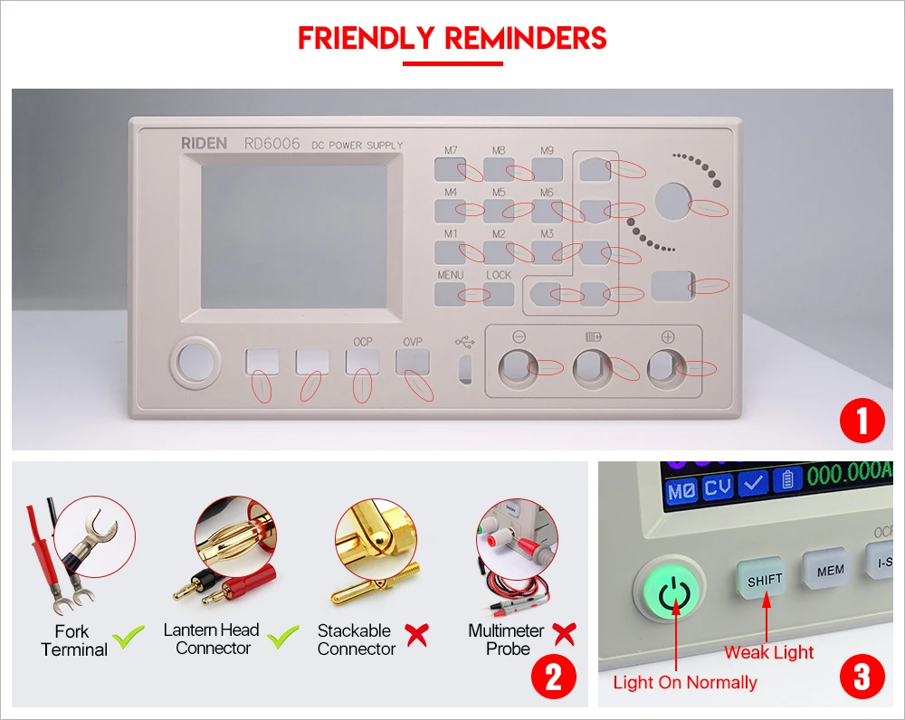 2. It is recommended to use fork terminal cables or lantern head cables as output cables, and you cannot use stackable connector(it may cause poor contact). Never insert the multimeter probes to the terminals(it will damage the terminals). as shown in picture 2
