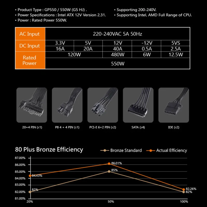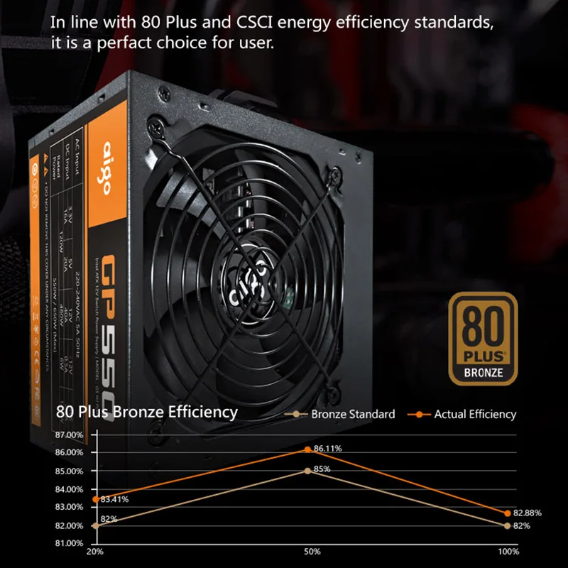 | Aigo GP550 Desktop Power Supply 750W 80PLUS BRONZE Quiet Power 12V ATX Active Power Supply Computer Cooling Fan For Intel AMD PC |