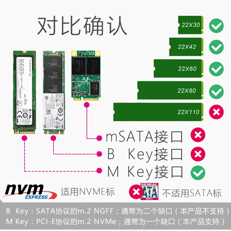Contrast confirmation: Applicable NVME logo, not applicable to SATA logo B Key: m.2 NGFF of SATA protocol, usually two gaps (this product does not support)