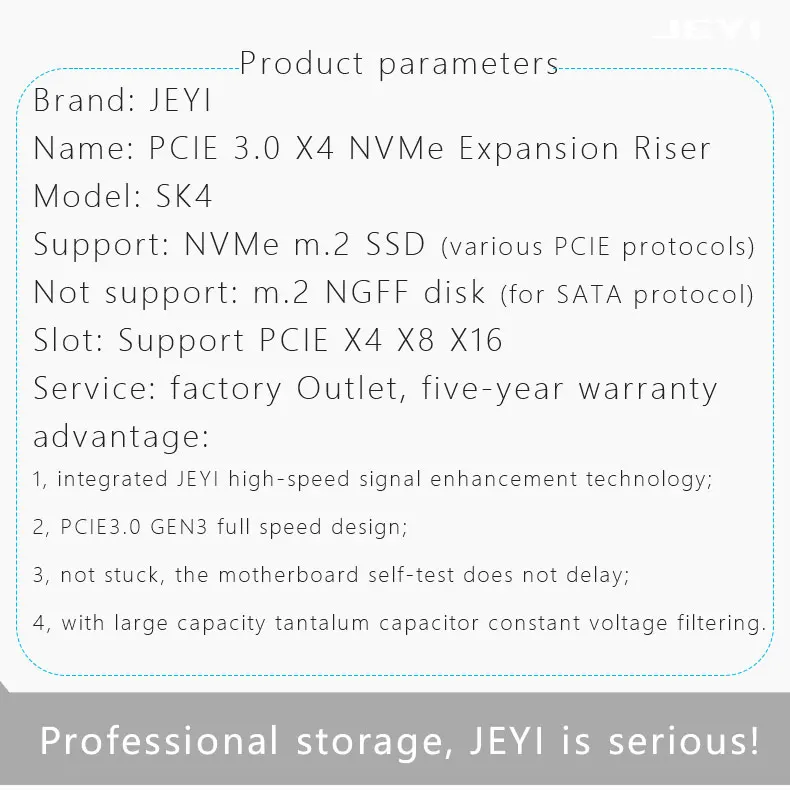 The best product you are looking for is "JEYI SK4 M.2 NVMe SSD NGFF TO PCIE X4 adapter M Key interface card Suppor PCI Express 3.0 x4 2230-2280 Size m.2 FULL SPEED good". This product is available and ready to be purchased. Get attractive discounts every time you shop in our store (aliexpress.com). Aliexpress also provides a coupon of $ 3 for the first buyer to shop there. don't forget to bookmark our store page so you can go shopping again anytime..
