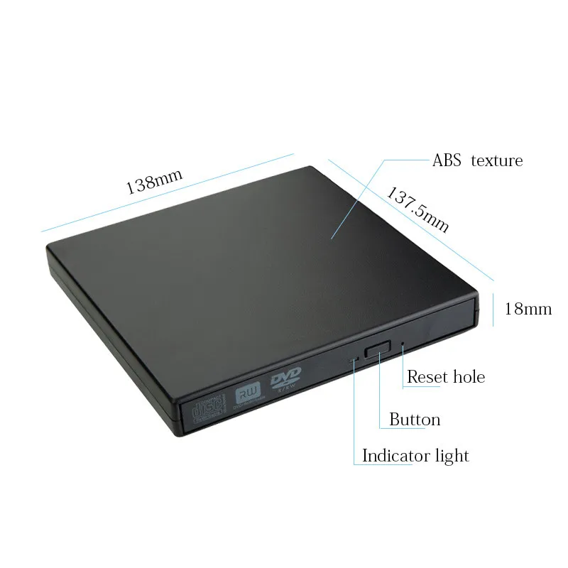 Product Features: 1. USB 2.0 (No AC wall adapter required). 2. Plug & Play. 3. USB Optical Drive with the durable plastic casing. 4. Supports GHOST, XP, SE, ME, VISTA, WINDOWS 7, WINDOWS 8/10, Mac 5. plug-and-play drive requires no software and is conveniently powered through your USB port. 6. Works for all PC, Laptops, Notebooks, and Desktop. Write and Read Speed: 8x maximum write speed (DVD±R) 6x maximum write speed (DVD+R DL, Double Layer) 6x maximum write speed (DVD-DL, Dual Layer) 8x maximum rewrite speed (DVD+RW) 6x maximum write speed (DVD-RW) 24x maximum read speed (DVD) 24x maximum write speed (CD-R) 24x maximum rewrite speed (CD-RW) 24x maximum read speed (CD) Data Transfer Speed: up to 33.3 MB/s (UDMA Mode 2)