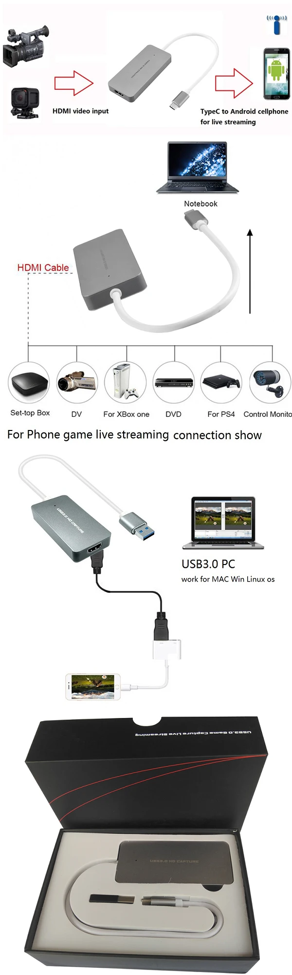 | Type-C Live streaming converter USB3.0, HDMI 4K 30HZ Video audio camera to USB3.0 PC UVC capture video up to 1080P60fps USB-C |