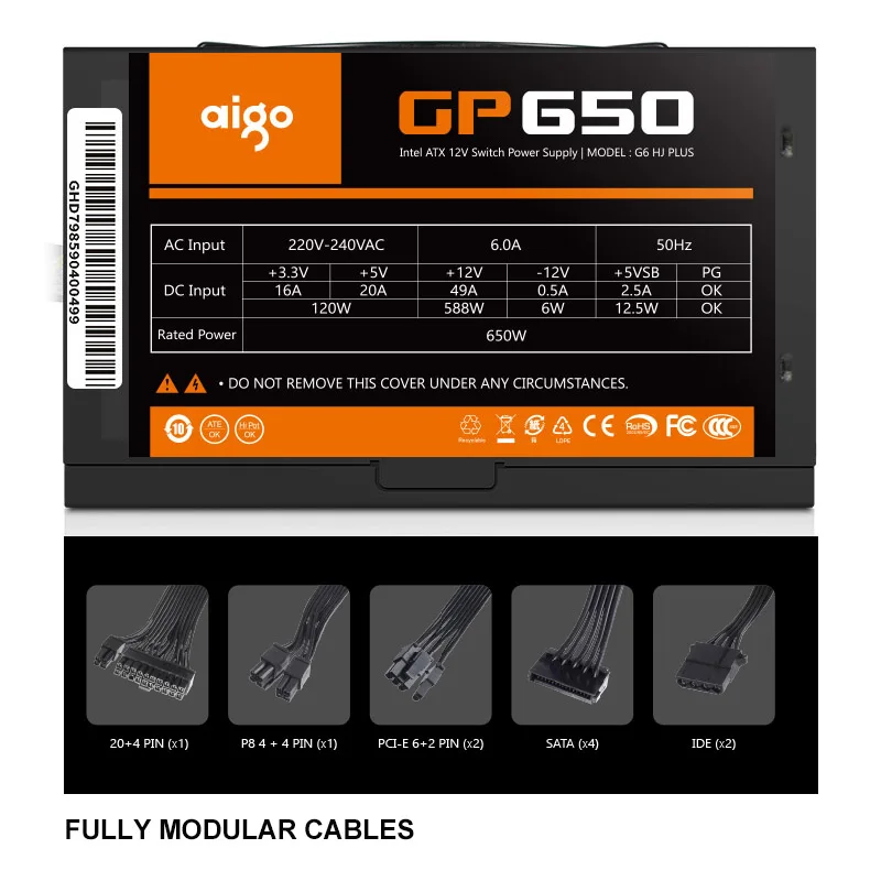 Aigo GP650 Power Supply 650W 80PLUS BRONZE PC Power E-sports Max 850W Power Supplies For Computer 12V ATX 12CM Fan Power Supply Package include:
