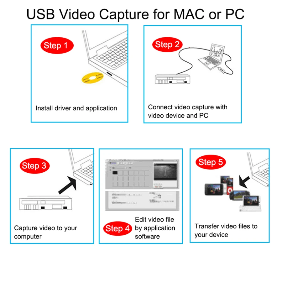 Overview:ezcap159 USB 2.0 Video Capture for Win&Mac, it can capture High-quality video and audio file direct by USB 2.0 interface for both of Windows OS and macOS. So, you can use the hardware with your Windows or Mac very simple. We have enclosed two professional video editing softwares for Win and Mac, then provide best editing function for you. Video Studio is video-editing software that makes editing your movies as fun as shooting them. The new Video Studio Movie Wizard helps novice users finish stylish movies in only three steps. Share finished projects on DVD, tape, the Web, and mobile devices. For video editing with Mac, you need to do that by QuickTime, then you can get the perfect video. Features: - Include Professional and easy to learn & used video editor software- Popular USB 2.0 interface and not need other- Capture Video & Audio though USB 2.0 interface- Support Brightness, Contrast, Hue, and Saturation control- The dimension suitable that is easy to carry- Could capture audio without the sound card- High plug & play- Support For All Formats: record in DVD+/-R/RW, DVD+/-VR, and DVD-Video- Applying to internet conference / net meeting.System Requirements for PC:PentiumIV 1.7GHz CPU or above512MB RAM or aboveGraphics card supports DirectX 9.0CVGA card with 32MB memoryOne available USB 2.0 portCompatible with Microsoft Windows XP/Vista/7/8/10One available USB 2.0 portSystem Requirements for Mac:OS X 10.4 or above, including 10.8 OS X1.5GHz Inter Core Solo or above1GB 667 MHz DDR2 SDRAM or more500MB free hard drive spaceCD-ROM or DVD-ROM driveOne available USB 2.0 portNote 1: You need to buy Video and Audio cable, and S-Video cable to connect the USB Video Capture with your analog video device. You need to buy the Scart Video/Audio adapter if the output of your video source device is Scart type.Note 2: The following devices can be used as analog video sources: Video recorder, DVD player, Video camera, Set-top box, Game player and any device that provides an analog video signal.Specifications:Brand Name: ezcapModel: ezcap159Interface: USB 2.0 standardInput: Composite Video(RCA), S-Video(miniDIN 4pin), Audio L/R(RCA)Color: BlackPackage Size: 16 * 14 * 5cm / 6.3 * 5.51 * 1.97inPackage Weight: 157.6g / 5.56ozPackage List:1 * Video Capture Device1 * Software CD1 * User Manual (English)