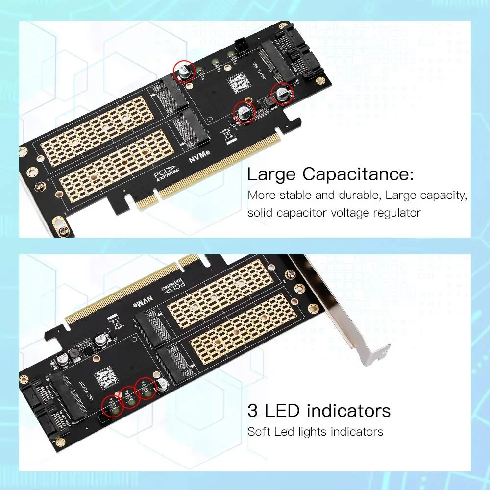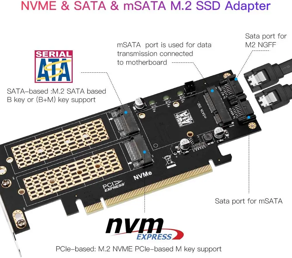 | Onvian 3 in 1 NGFF and mSATA SSD Adapter Card M.2 NVME to PCIe 16X/M.2 SATA SSD to SATA III/mSATA to SATA Converter+2 SATA Cable |