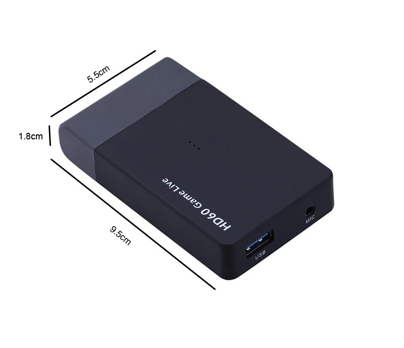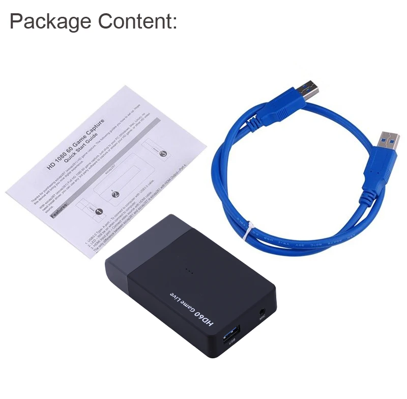 Features:* Plug and play, no need to install driver, just use 3rd party software to capture your HD video.* High quality video recording, support 4K and 1080P video capture and streaming.* USB 3.0 high speed interface, powerful to get HD video into you computer up to 4K.* With MIC input, you can record microphone audio through it so that you don't even miss the narration.* With HD input and output port, you can play and record the 1080P video at the same time.* Live RTMP streaming to YouTube, DailyMotion and more.* Supports for Windows, for Mac or Linux. SpecificationsInterface USB 3.0Video Input Digital: HDMIAudio Input Digital: HDMI, Analog: 3.5mm Micro PhoneVideo Output Digital: HDMIAudio Output Digital: HDMIApplicable Connection WiiU, Xbox 360, Xbox One, PS4, HDMI Camera, Medical device … Resolution Input / Output: 720 x 480(60p), 720 x 576(50p) ,1280 x 720(50p), 1280 x 720(60p), 1920 x 1080(50i), 1920 x 1080(60i), 1920 x 1080(24p), 1920 x 1080(25p), 1920 x 1080(30p), 1920 x 1080(50p), 1920 x 1080(60p)Capture: Upto1080P@60fps Operating System Windows 7/8/10, OS X 10.9 or later, Linux, Android. Desktop: Intel Core i5-3400 + NVIDIA GT630, Laptop: Intel Core i7-3537U 2.0 GHz + NVIDIA GT735, Mac: i5 quad-core or above, VGA card supporting DirectX 10, Sound card, 4GB RAM, Powered USB 3.0 port: Intel chipset with native USB 3.0 host controller (Renesas, Fresco …) Software Compatibility OBS Studio (Windows, OS X), OBS Broadcast (Windows, Mac OS X),Adobe Flash Media Live Encoder (Windows, OS X), Real Producer Plus (Windows), QuickTime Broadcaster (OS X), QuickTime Player (OS X), Windows Media Encoder (Windows), Potplayer (Windows), Xsplit Broadcaster (Windows, OS X), VLC (Windows, OS X, Linux), Wirecast (Windows, OS X), vMix (Windows), AMCAP, and etc. Support API Windows: DirectShow, DirectSound, OS X: QuickTime, Linux: V4L2, ALSAMultiple devices on one computer Support for connecting multiple USB devices to one system, support for setting the device serial number as the device name shown by application softwareUser Interface One LED indicator for working statusPackage Contents ezcap261M HD60 Game Live, USB 3.0 cable, ManualDimensions 98(L) × 58(W) × 18(H) mm Weight 65g Package Content : 1 x EZCAP USB3.0 HDMI HD Video Capture1 x USB3.0 Cable1 x User Guide