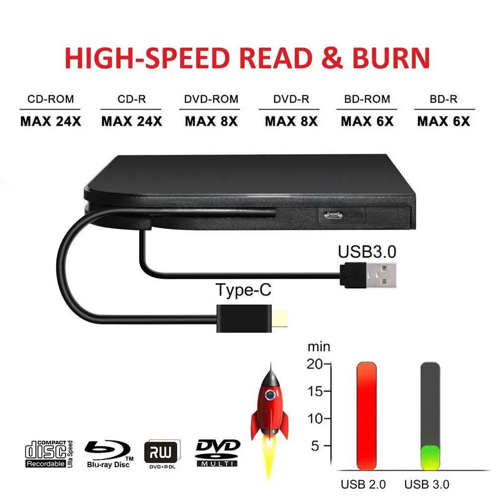 - 【USB3.0 High Speed Interface】Ultra slim portable size is equipped with USB 3.0 high speed interface,bringing you faster data transfer speed and stable performance, With this External Blu-ray Drive you can record CD/DVD/BD disc, music, videos, installing software or create CD/DVD/BD backup disc