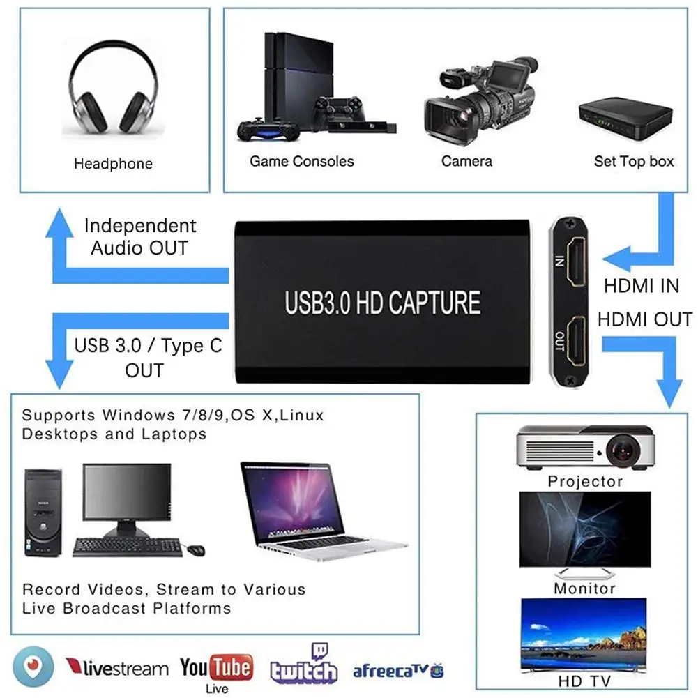 3. Compatible with Multiple Systems: The capture card is suitable for Windows 7, 8, 10, Mac OS X 10.9 or above, Linux and many other systems. It supports software such as PotPlayer, AMCap, VLC, Skype, Google Hangouts, WebEx, etc.