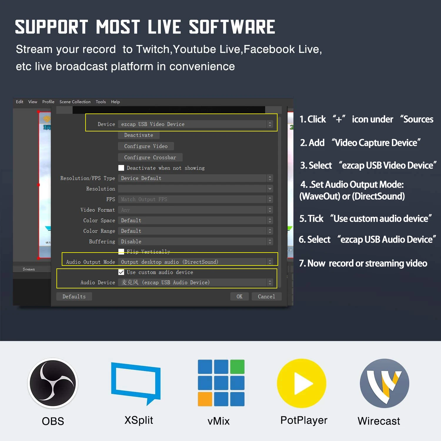 OBS Studio (windows,OS X); Windows Media Encoder (Windows);Adobe Flash Media Live -Encoder (Windows, OS X); Real Producer Plus (Windows); VLC (Windows, OS X, Linux); QuickTime Broadcaster (OS X); QuickTime Player (OS X); Wirecast (Windows,OS X); vMix(Windows); Potplayer(Windows)and etc.System Requirement: