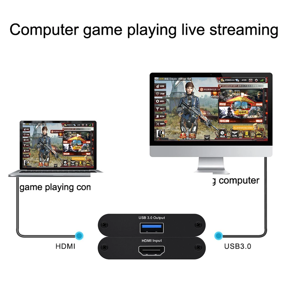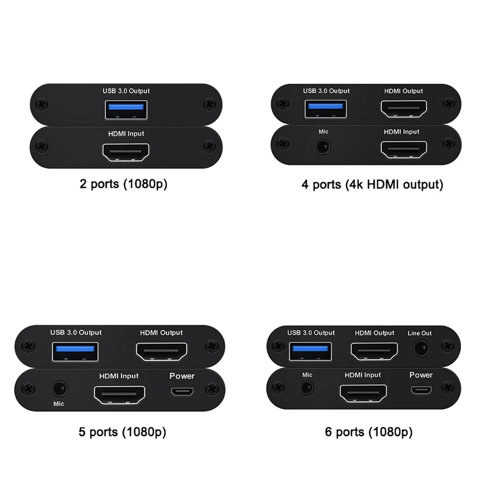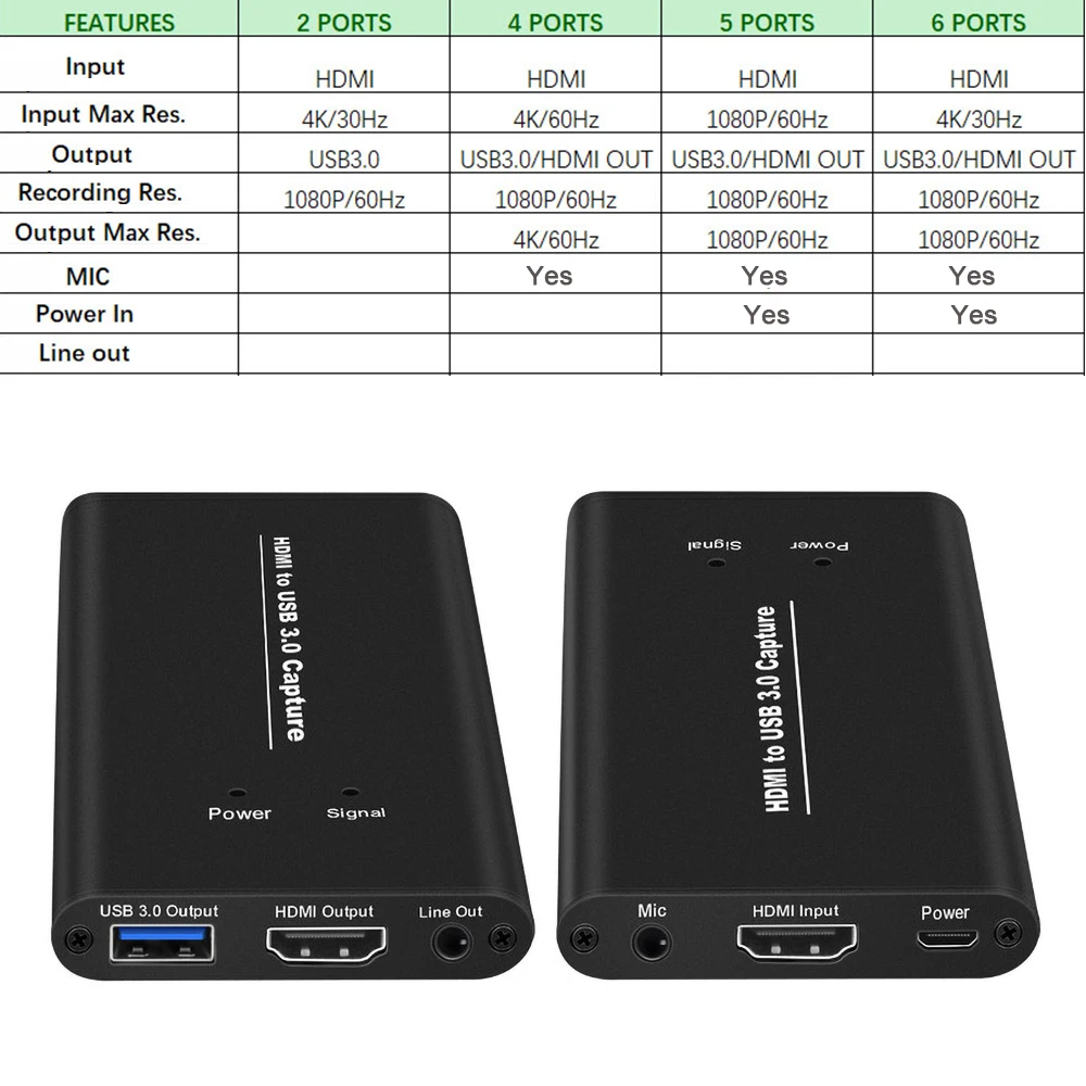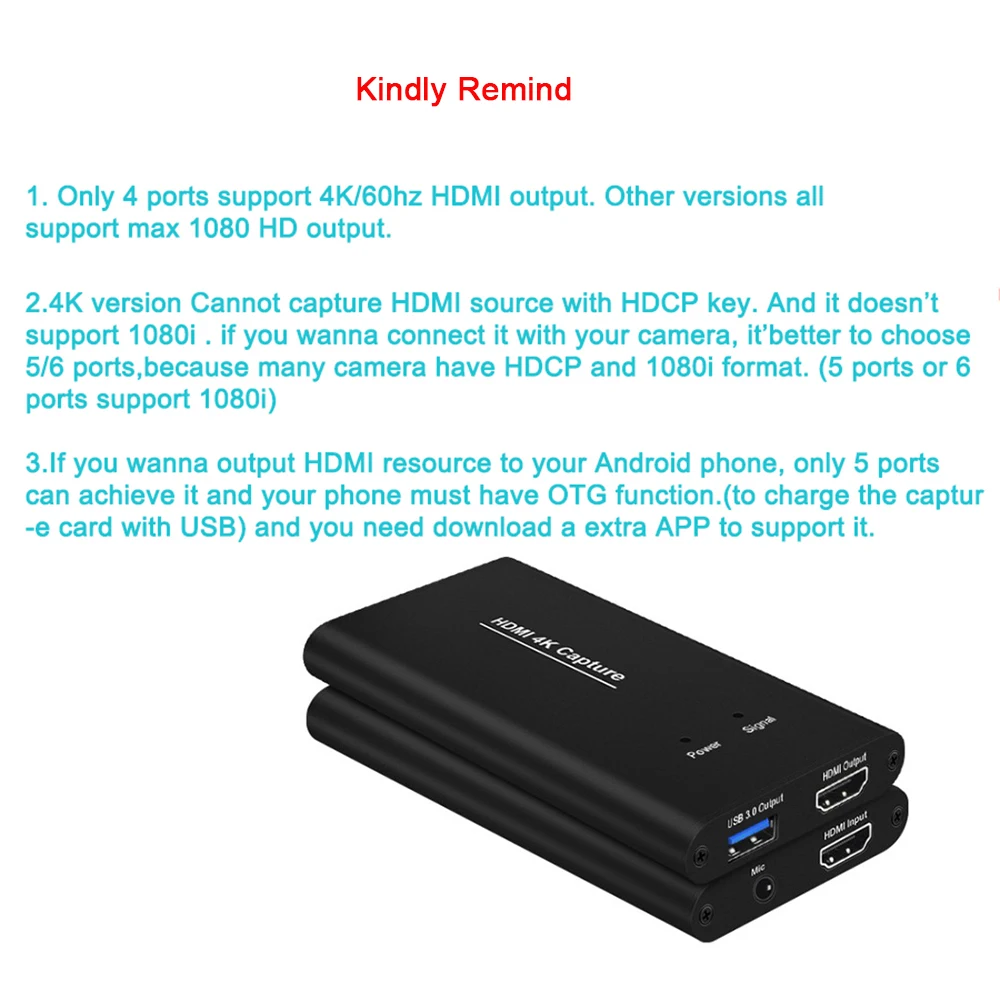 NOTE : Only 4 ports support 4K/60hz ouput. But 4K version Cannot capture HDMI source with HDCP key. And it not supports 1080P . if you wanna connect it with your camera, please do not choose 4k version. (5 ports or 6 ports support 1080P) If you want to connect a mobile phone or tablet, you can use TV Stick Features 1.It can capture one single channel HD HDMI video signals 2.The capture resolution up to 1080P/60Hz, input resolution up to 4K/60Hz, the HDMI Loop-out resolution is the same as input resolution 3.Support Mic recording input 4.Support MJPE and YUY2 5.Support UAC&UVC,support 48 KHz PCM audio 6.It need to install a driver with some of the Windows7 syste 7.It is compatible with FOR Windows 7,FOR Windows8,FOR Windows8.1,FOR Windows10 or later, FOR Linux OS, FOR Mac OS operating systems. 8.USB3.0, 300~350MB / s throughput max and it is compatible with USB 2.0 (40MB/s throughput max). 9.It can automatically detect the input video formats and it will adjust to the set output size and frame rate automatically. 10.It can automatically detect the input audio formats and swift it to 48KHz PCM audio. 11.Two capture can be used on one PC 12.The firmware can be updated. 13.With good picture quality, the RGB color range is 0-255, less delay. 14.Support for all third-party player software compatible with UVC and UAC protocols. Computer System: FOR Windows® 10 / FOR Windows 8.1 / FOR Windows 7 (SP1) PC: FOR Intel® Core™ i5-4440 3.10 GHz + FOR NVIDIA® GeForce® FOR GTX 660or above Notebook: FOR Intel Core i7-4810MQ + FOR NVIDIA GeForce GTX 870M or above 4 GB RAM (suggest 8 GB) Mobile phone: for Android phone (Most phones are supported) Only USB2, no USB3(for android UVC driver not support USB3) If it's an for Android phone with USB, then need pure USB2 cable force into his mode to use. Notice 2: 1. Please do not use HUB or USB extension cable. 2. A low computer configuration will cause the recording screen to blinking randomly or black. 3. This is a normal phenomenon that the recording screen and the original screen is not synchronized. Package included: 1 x Video Capture Card 1 x USB Cable 1 x User manual