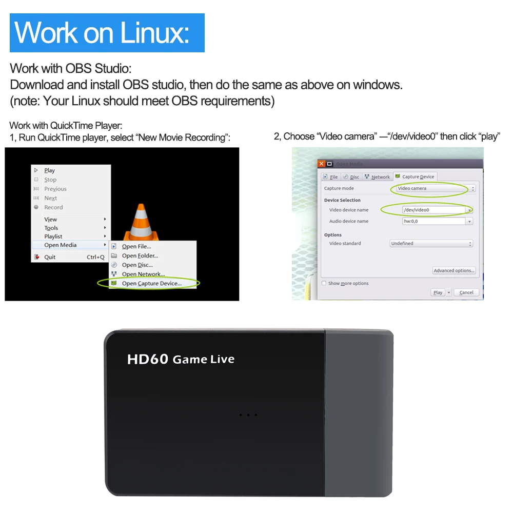Just plug the ezcap261M Full HD 1080 60 game capture to your PC (for Windows / Mac / Linux system), no need to install driver, and you can use any 3rd party software to capture or stream your HD game, or other HD video source.