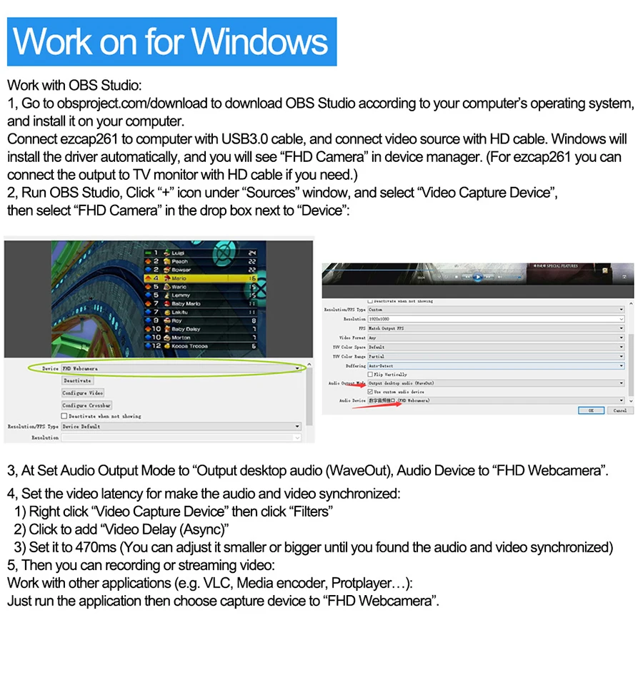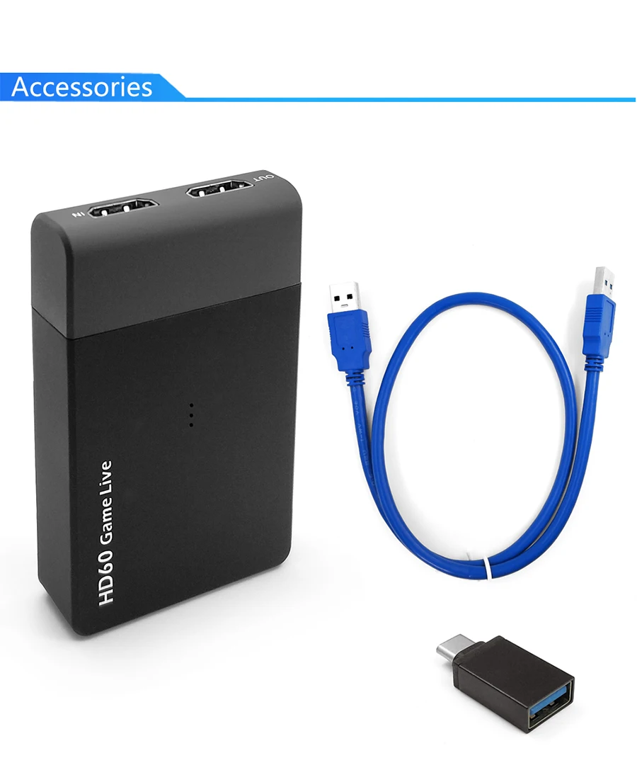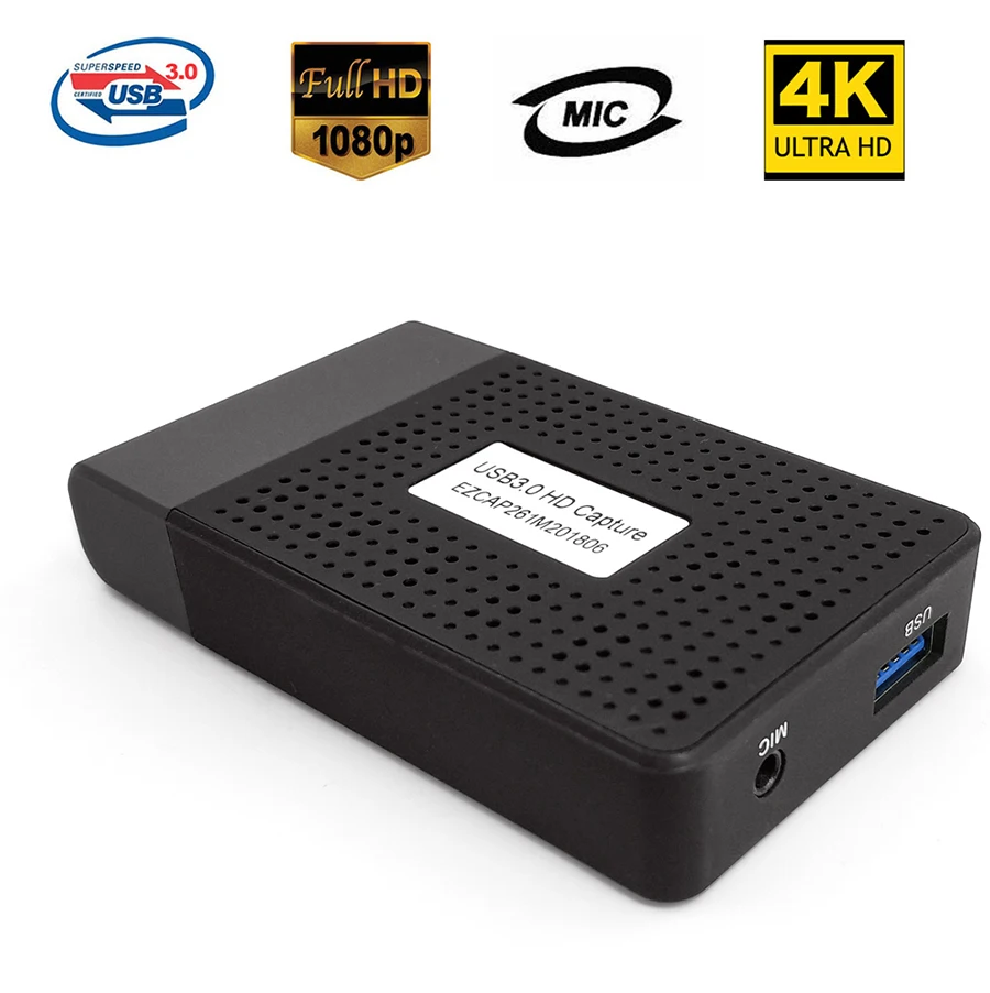With USB 3.0 fastest data transfer speed, it's simple and powerful to get HDMI video and audio into your computer, up to 1080@60fps. Support UVC standard, no driver installation required, and work with most software on Windows or Mac. Allow live video streaming, webcasting or video conferencing to Skype, Facebook live, YouTube live, Livestream,Ustream, Dacast, Wowza Cloud …With HDMI pass-through, can connect with big displayer to play game once you streaming. With Micro Phone input, can record your voice with video together easily. Features:* Plug and play, no need to install driver, just use 3rd party software to capture your HD video.* High quality video recording, support 4K and 1080P video capture and streaming.* USB 3.0 high speed interface, powerful to get HD video into you computer up to 4K.* With MIC input, you can record microphone audio through it so that you don't even miss the narration.* With HD input and output port, you can play and record the 1080P video at the same time.* Live RTMP streaming to YouTube, DailyMotion and more.* Supports for Windows, for Mac or Linux. Specification:Brand Name: ezcapModel Number: 261MInterface: USB 3.0Video Input: HD portAudio Input: HD port, 3.5mm MICVideo Output: HD portOS Support:for Windows 7, 8, 10; for Mac OS X 10.9 or later; LinuxResolution:720 * 480 (60p), 720 * 576 (50p), 1280 * 720p (50p), 1280 * 720p(60p), 1920 * 1080 (50i), 1920 * 1080 (60i), 1920 * 1080 (24p), 1920 * 1080 (25p), 1920 * 1080 (30p), 1920 * 1080 (50p), 1920 * 1080 (60p), 4KSoftware Compatibility:OBS Studio (for Windows / OS X); Windows Media Encoder (for Windows); for Adobe Flash Media Live - Encoder (for Windows / OS X); Real Producer Plus (for Windows); VLC (for Windows / OS X / Linux); QuickTime Broadcaster (for OS X); QuickTime Player (for OS X); Wirecast (for Windows / OS X); vMix (for Windows); Potplayer (for Windows) and etc.Record Quality: Max 1080p 60fpsColor: BlackItem Size: Approx. 9.6 * 5.5 * 1.9cm / 3.77 * 2.16 * 0.74inItem Weight: Approx. 55g / 1.93ozPackage Size: Approx. 15.4 * 10.7 * 4.2cm / 6.06 * 4.21 * 1.65inPackage Weight: Approx. 211g / 7.44ozPackage List:1 * Video Capture1 * USB 3.0 Cable1 * USB3.0 Female to Type-c Male Adapter1 * User Manual (English / Chinese)